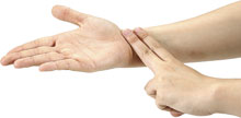- Have a stopwatch or clock with a second hand nearby when you are being active. You can do your check in the middle of your activity or at the end. (You want to count your heart rate within five seconds of stopping.) Find your pulse. An easy place to find your pulse is on your wrist in a straight line up from your thumb. Place the tips of your index and middle fingers where you feel the pulse on your wrist (as in the picture above). Press lightly. Count the number of beats for 30 seconds. Multiply that number by two. Start the count on a beat, which is counted as "zero."